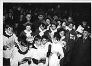 Part of the Library collection collectionFor many years there was a ceremony when the traditional Christmas tree was given to the town and lit up in front of Wesley Church. This picture shows a choir at the celebration on 19th December 1957.