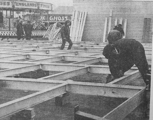 Workmen were hurriedly constructing the dodgem track ready for Easter visitors in 1971. The track, at 90 feet by 50 feet was the second largest in the U.K., the only larger one being at Woburn.