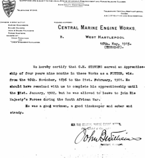 A testimonial letter from CMEW written for Charles Henry Stevens in 1915, believed to help him enlist with the RNVR as an engine room artificer to fight in the Great War. It seems to have been successful as Charles served on the protected cruiser, HMS Edgar, seeing action in the Mediterranean and The Dardanelles.