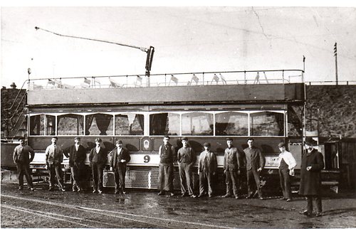 Tramcar No.9, one of a unique pair of cars (No.8 being the other), constucted by the Greenland depot workshop staff in 1904. These two 84-seat cars are thought to have been the largest to have operated on a British 3ft 6in gauge tramway. The gentleman at the right is believed to be the manager at that time, William H Bettison.