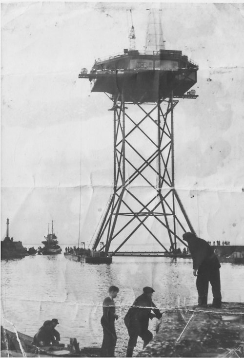 Old N.C.B. drilling platform being floated out of Hartlepool Docks. The rig was first floated on July 21st 1958 and on August 2nd left Hartlepool to take up position at Blackhall having been delayed a number of times because of poor weather and sea conditions.