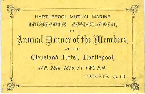 Hartlepool Mutual Marine Insurance Association, Ticket for Annual Dinner at the Cleveland Hotel in 1875.