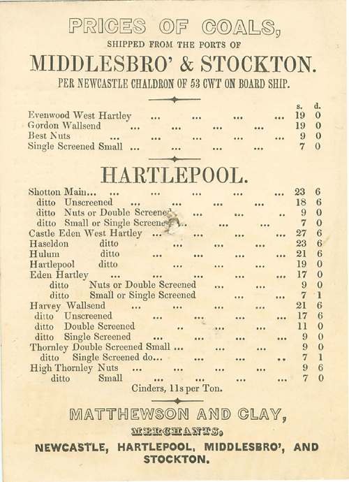 A printed Notice showing Coal Prices being charged by local merchants Matthewson and Clay - date unknown.