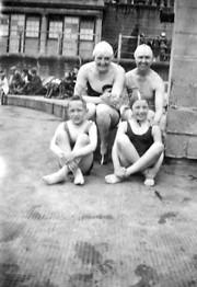Donated by Mrs. Maureen LedingtonJeannie Lappin (wearing some classy pool shoes), Mary Scurr, Billy and Olive at the Hartlepool Headland Outdoor Swimming Pool, in 1931.