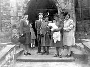 Donated by Mr. John RobinsonA happy group standing outside All saints Church, Stranton, after the baptism of their Ozzy and Vera Mortimer's first daughter Joan in 1946. From left to right are: Gladys Kell (Ozzy's sister-in-law), with daughter Florence, Tommy, Ellen Kell and her sister Annie Shorthouse (holding baby Joan), and Vera. Gladys Kell (nee Bushby) was a nurse who worked with Jennie Kell at Hartlepool General Hospital, and had married Harry Kell, Ellen's son.