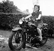 Donated by John RobinsonDoris Robinson sitting on husband Jim's 350cc Royal Enfirld motorbike, about 1951. The bike was adapted to take a sidecar.