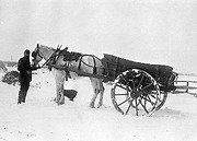 Donated by Bowes Museum, Barnard Castle, County DurhamJim Dodds on a winter's day with his horse & cart. Jim (James) Dodds was a carter & lived in Bowsers Yard with his wife, Jane, & their family. At the time of this photo Jim would have been aged about 37.