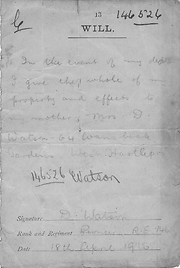 Donated by Mr. John WatsonA brief, First World War soldier's Will, written in pencil, on 18th April, 1916.