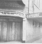 Donated by Hartlepool Library ServiceThis is one of four images from a hand-written history of the Empire Theatre by an un-named author. The caption reads "side view of the theatre showing the rear entrance boarded up and glass broken". It is not dated, but text in the history suggests the photographs were taken in 1964 or a little later.