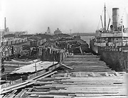 Donated by Hartlepool Museum Service'C' Jetty Union Dock looking across towards Gray's shipyar buildings. Queens Rink Ballroom on right. Rolling stock with pit props in the foreground.