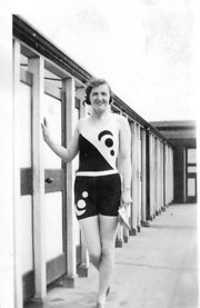Donated by Mrs. Maureen LedingtonJeannie Lappin modelling a striking Art Deco swimsuit at the Hartlepool Headland Outdoor Swimming Pool in 1931.