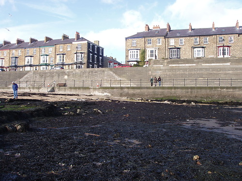 2012 - the remains of the Hartlepool Headland Outdoor Swimming Pool are almost invisible under a mat of seaweed, while all that remains of the shoreside buildings are "ghost" marks.