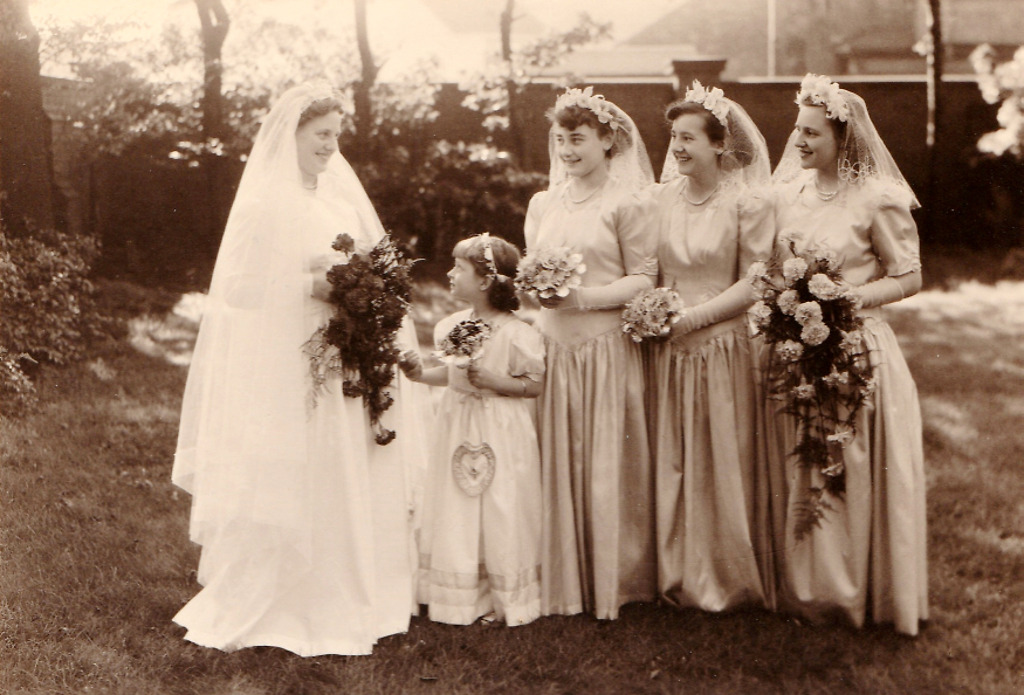 Joan Desborough, born 1929, married Maurice Gilbraith in September 1950 iat St Aidan's West Hartlepool. The matron of honour was Myra Desborough and they all wore dresses of parachute silk. The photo is taken in the garden of the church.