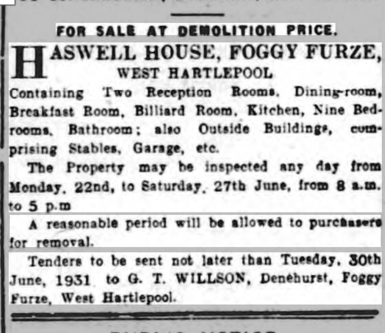 This 1931 advert from Hartlepool Northern Daily Mail shows te property for sale 'at demolition price'. George Willson , George by then lived at Denehurst over the road and this property exists today known by loacls as the Pineapple House.