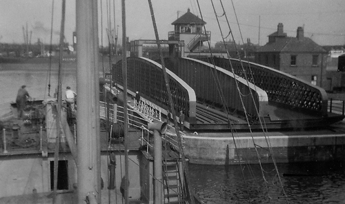 Joseph Tombling and a friend setting out for a cycling tour of Norway in 1938. They are on board the small Norwegian steamer Gol, bound for Bergen, which is just passing the swing bridge as it enters the North Basin.