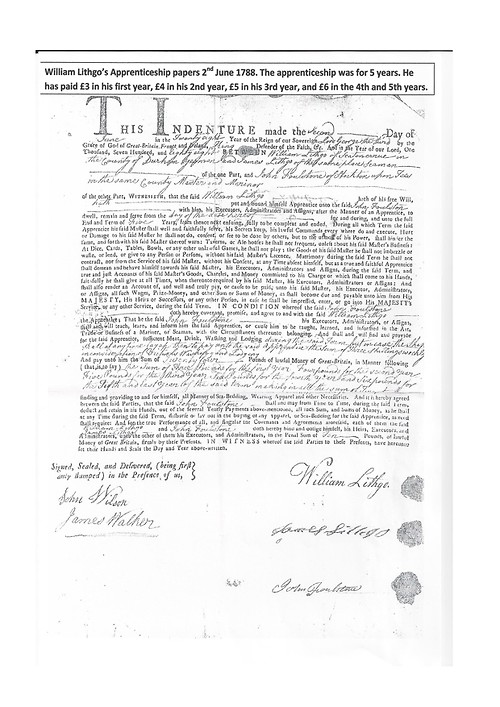 Donated by Cliff CordinerThis photograph is of William Lithgo's apprenticeship papers as a Tees pilot for which he was paid a total of £25.00 over a period of 5 years from 1788. He was paid £3.00 in his first year, £4.00 in his second year, £5.00 in his thirs year and £6.00 in his fourth and fifth year.