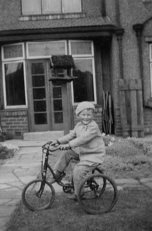 Having outgrown his earlier tricycle, young John Watson now has a new machine. This photograph was taken sometime in 1940, and in the background, leaning against the side of the house, are wooden blackout shutters.