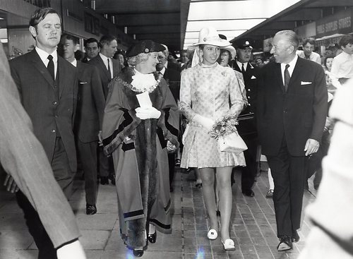 Princess Anne's visit to open the Middleton Grange Shopping Centre, May 27th 1970. She can be seen walking down the bottom end of the shopping centre, possibly on her way to the College of Art. The Princess is accompanied by the Mayoress Mrs. Tuson and other dignitaries and bodyguards. Pools Surplus Stores is visible on the right.