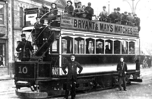 Car No.10, at the top of Church Street, West Hartlepool, in about 1898. This car seated 62 people and is fitted with a buffer and chains for the attachment of a trailer. The building partly obscured by the car is the Central Hall, which was replaced in 1901 by the four-storey Central Buildings, which was later to include the Devon Grill.