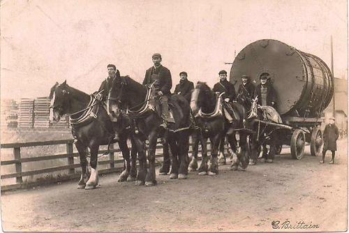 A 6-horse team hauling what is believed to be a ship's boiler or other engine part, passing the pit-prop field, date unknown.
