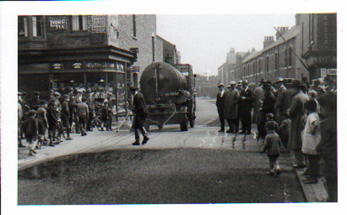 A very large audience appear to be watching tar spreading on the road. Street unknown but shop on left appears to be Newton's ?