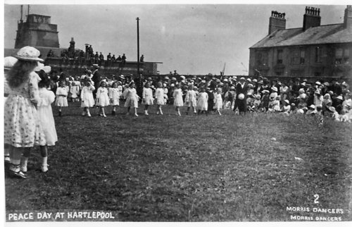 Peace Day celebrations on the Friarage Field, with the Heugh Gun Battery and Lookout (top left).