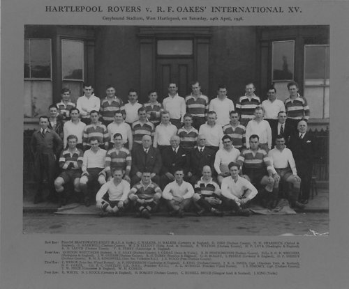 Hartlepool Rovers for a match Annual match against an R.F. Oakes Intenational XV, played at the Greyhound Stadium, West Hartlepool, on April 24th, 1948. At 4.00 p.m. Ivor Preece the Coventry and England fly half dropped a goal for 4pts to the Oakes score, this is beleived to be the last 4 pt drop goal, since that time the drop goal has been rewarded by 3pts only.