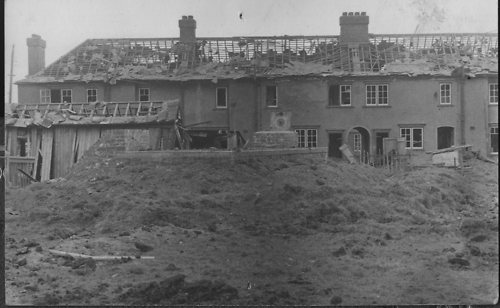 Houses left with no roof tiles after bombing. Air raid shelter in the foreground.