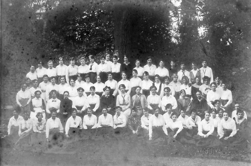 A group photo from Darlington Teacher Trainging College. Adeline Sample is on the back row, fourth from the right. she is wearing a dark top unlike most of the other women.