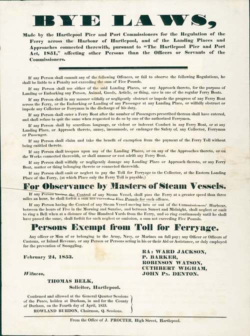 Bye Laws relating to Hartlepool Ferry 1851.