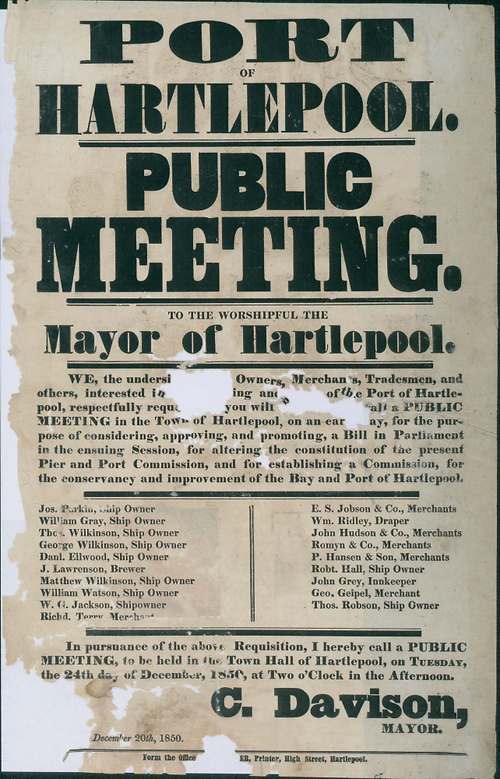 Port of Hartlepool, public meeting 1850 regarding a bill to be introduced to Parliament.