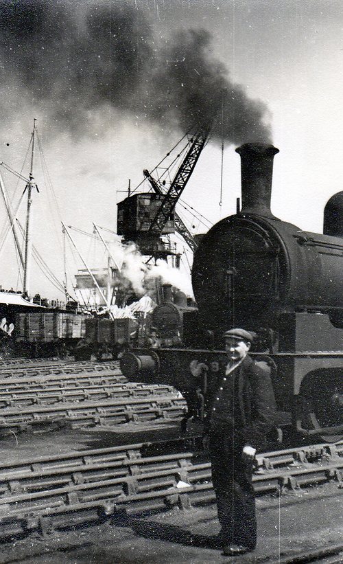 A steam engine and driver on the docks with a crane unloading timber in the background.