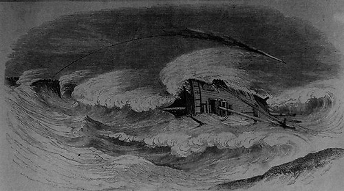 An illustration of the Mary Gray of Montrose when she was wrecked on Longscar Rock on 26 September 1851. The Seaton Carew lifeboat was launched but although they attached the boat to the stricken vessel with a grapnel they were obliged to abandon the attempt because of the heavy sea. Carte's Rockets were fired & eventually all four of the crew were brought safely to shore.