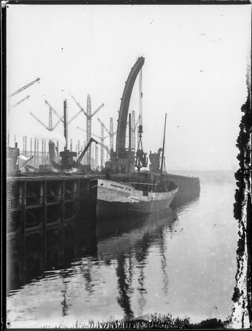 A Grimsby trawler being reboilerd using the swan neck crane at Irvine's Quay.