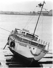 Donated by Hartlepool Museum ServiceA Grimsby trawler being reboilerd using the swan neck crane at Irvine's Quay.