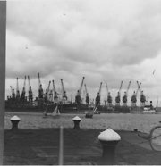 Donated by Douglas FerridayView across the Coal Dock taken in 1963. Sixteen cranes working.