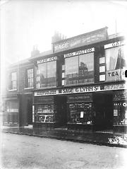 Donated by Douglas FerridayPossibly around 1920 or before?, Sage's had a tea room to the right which possibly has another name R and W .... above it. At this time, the shop advertised trunks and bags and was noted for leather goods. It was also a commercial and family stationer,printer and bookbinder.
